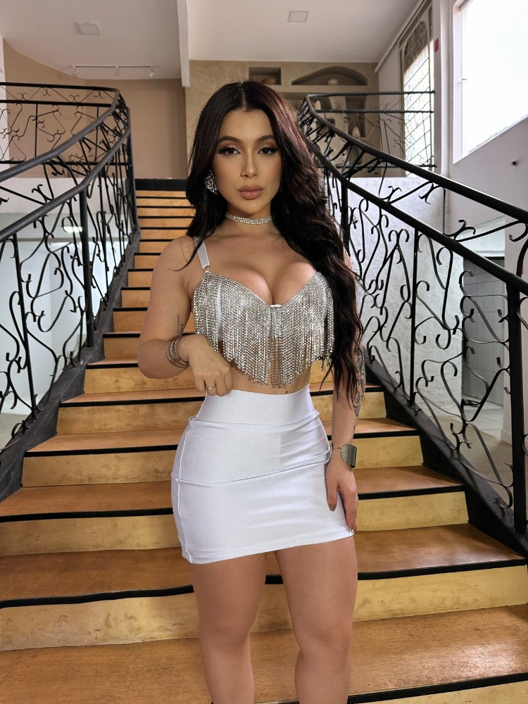 Tecido short saia suplex poliamida e o sutiã reforçado, possui bojo, com bordados manuais.